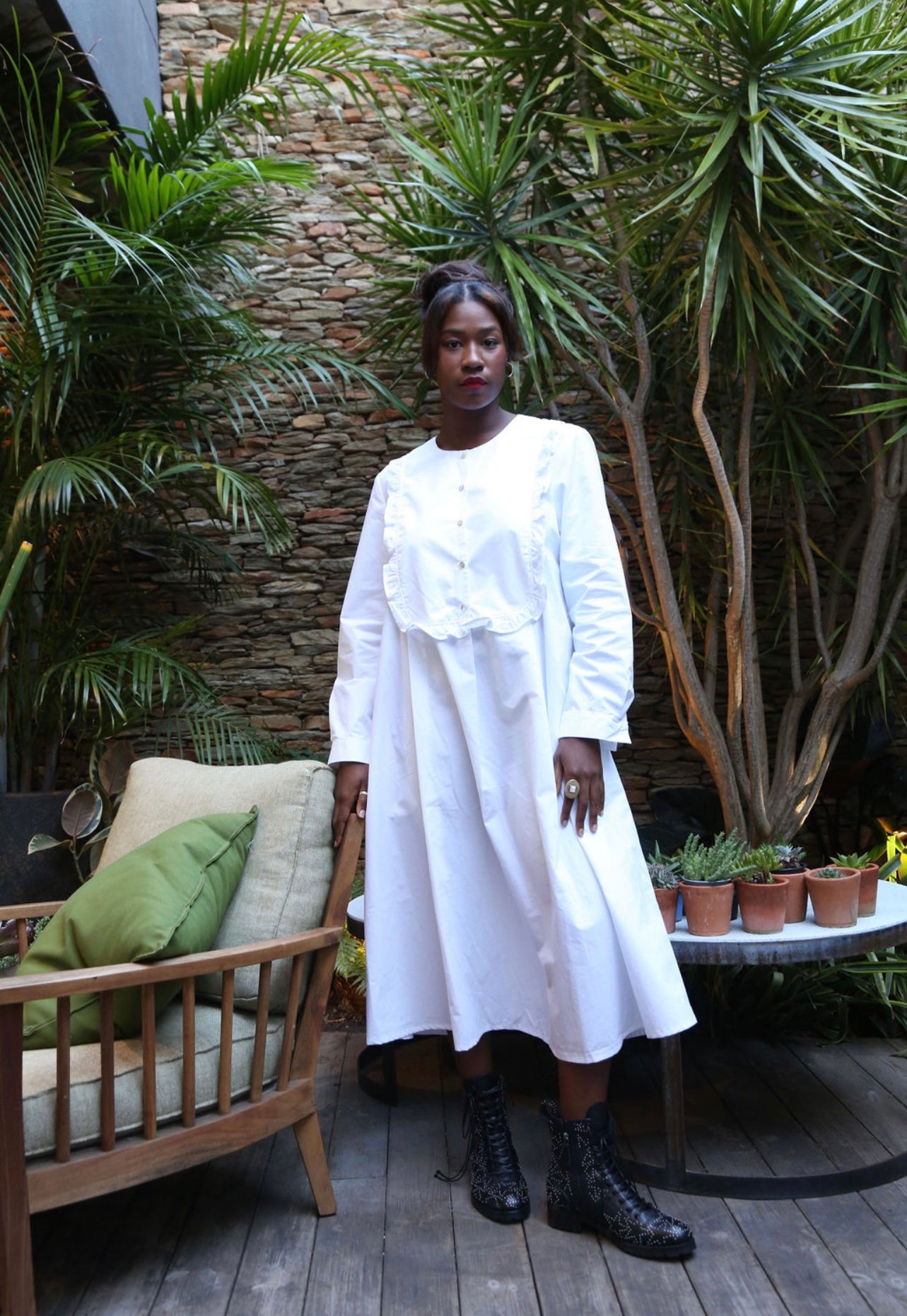 100% Cotton Poplin button up dress with frill detail.